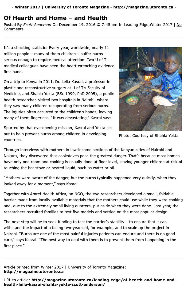 To this day, Dr. Kasrai continues to support efforts on improving the lives of people, particularly in third world countries. A few years ago, she formed a partnership with AMREF (African Medical and Research Foundation) while performing research on burns, one of the biggest risks for children under five years old because of open-fire cooking methods. With a grant from the United Nations, Dr. Kasrai is currently exploring options on how to effectively protect children from burns with barriers.